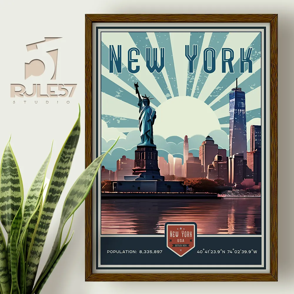 Experience the iconic skyline of New York City in our Retro Cityscapes Collection, featuring a scenic view of the skyline from the water, highlighting the Statue of Liberty as a symbol of freedom and the city's iconic skyline in a classic retro print.