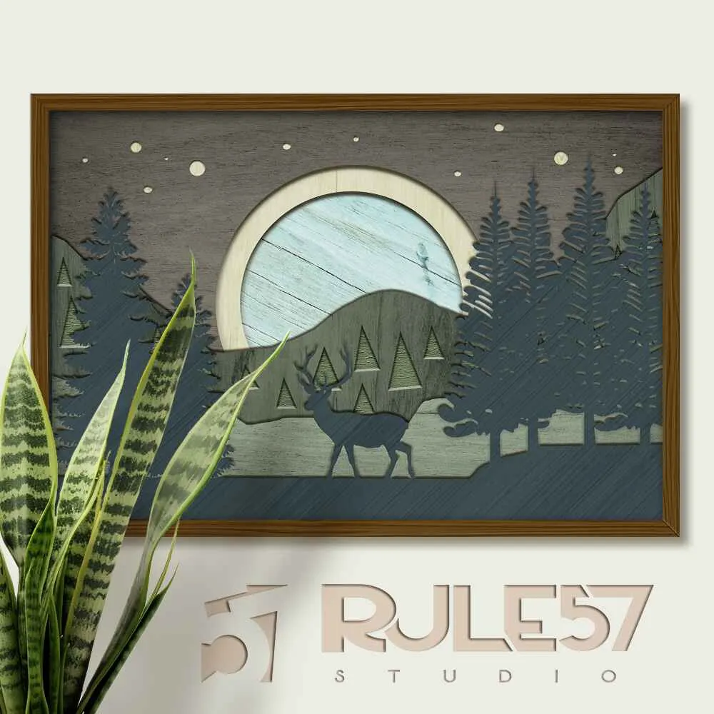 Immerse yourself in the beauty of our latest print from the Layered Woodland Landscapes collection. Here we showcase a Canadian forest at night, illuminated by the gentle glow of a full moon, with a solitary deer standing in a serene open field. Crafted in layered 3-dimensional wood, the piece combines shadows and natural wood grain to create a captivating representation of nocturnal tranquility.