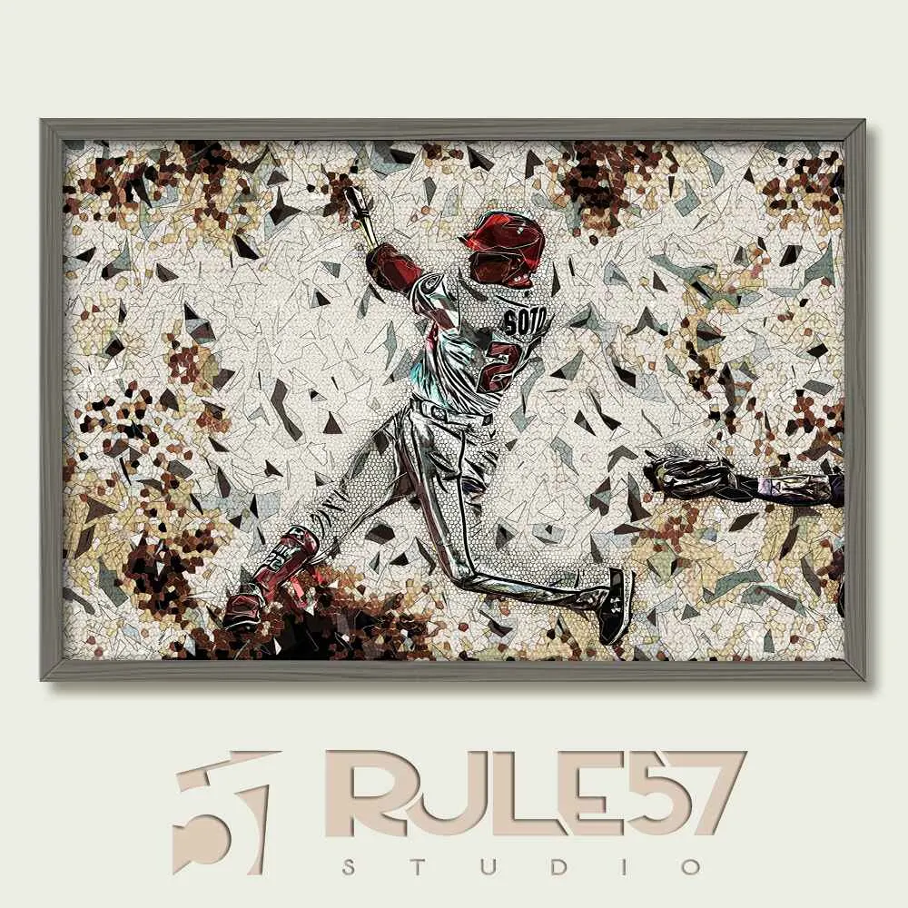 Juan Soto’s iconic swing, frozen in time, captures the essence of his game. This print from the Vivid Sports Portraits Collection is a bold tribute to one of baseball’s most electrifying players, ideal for any fan.