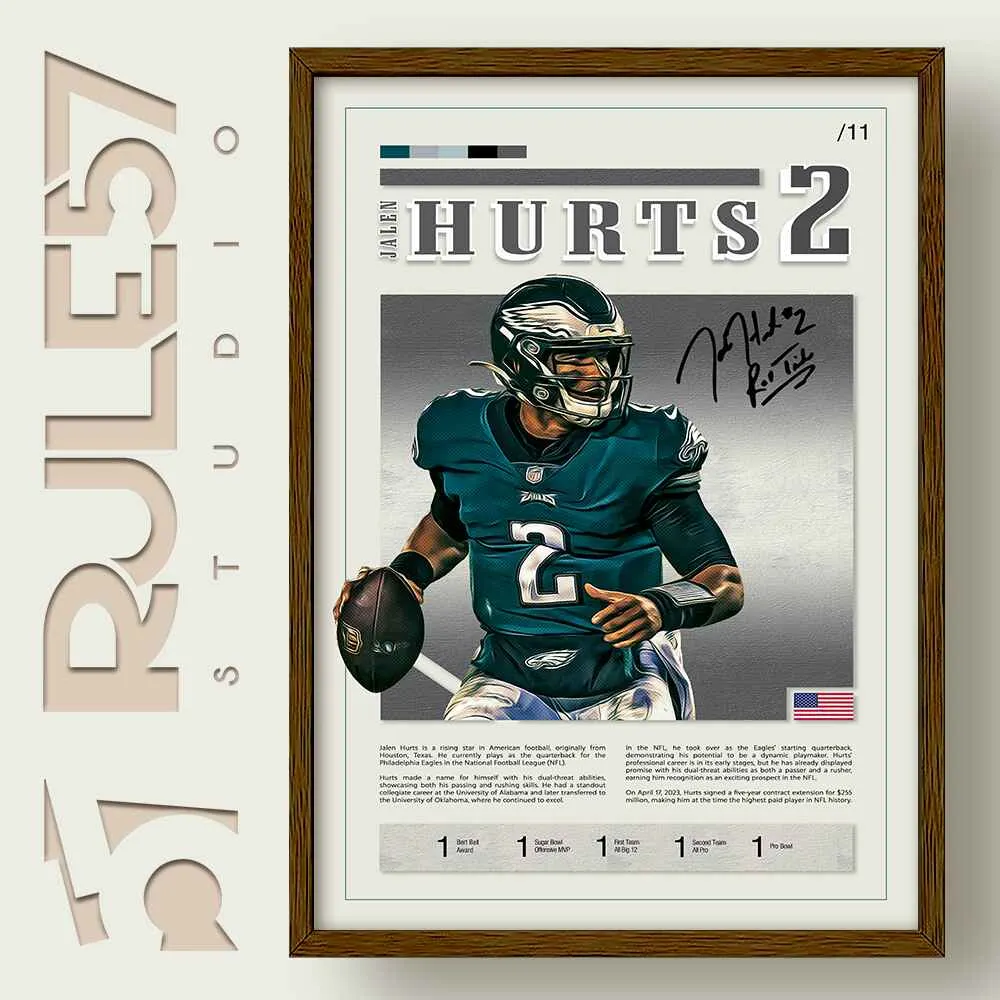 Celebrate the athletic prowess of Jalen Hurts with our Mid-Century Sports Legends Collection. This print showcases Hurts in the moment of preparing a pass, rendered in a classic mid-century style. Complete with text detailing his career milestones and accolades, it’s a perfect homage to a football star on the rise.