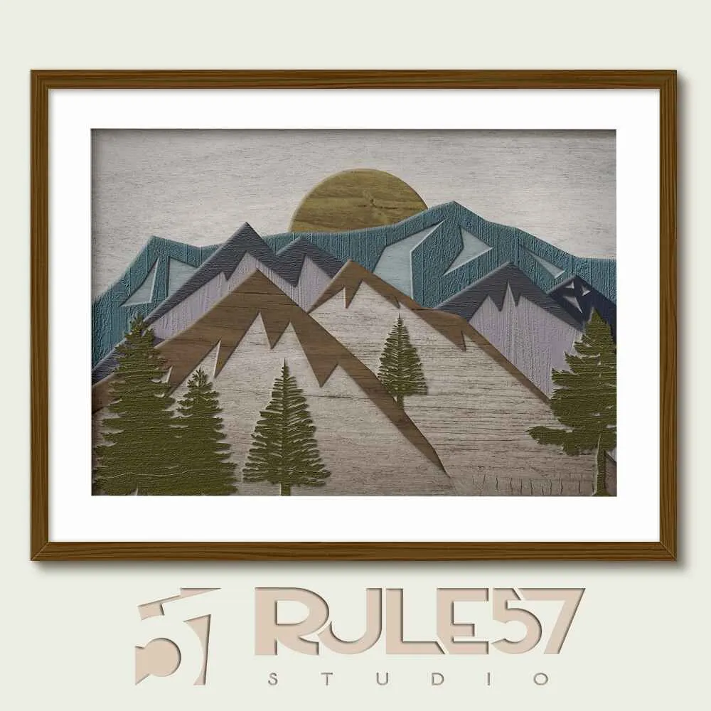 This latest piece depicts a stunning mountain range with dense evergreens, with a full moon setting behind the hills. The artwork’s natural earthy palette of blue, green, and gray, combined with layered 3-dimensional wood, creates a serene and captivating landscape. Perfect for infusing any room with a sense of peaceful beauty and natural wonder.
