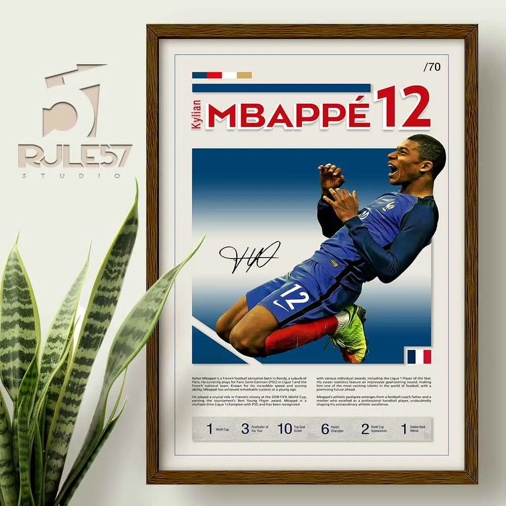 Celebrate the exuberance of Kylian Mbappe with our Mid-Century Sports Legends Collection. This print showcases his famous slide on knees goal celebration, set in a retro mid-century design. The accompanying text highlights his impressive career and accolades, offering a lasting tribute to this football superstar.