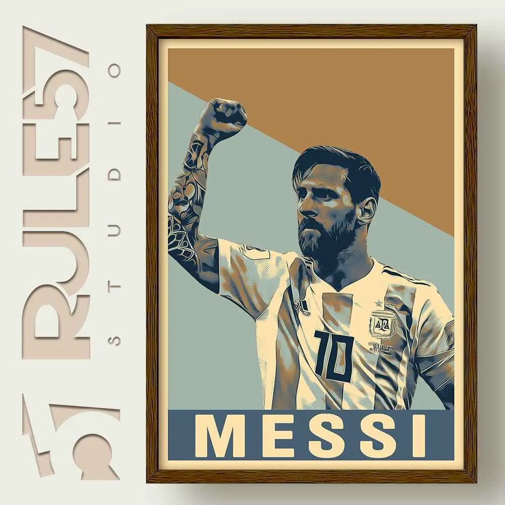 Relive the greatness of Lionel Messi's professional career with our retro-style print, showcasing his remarkable skill and iconic status in a vibrant three-tone color design.