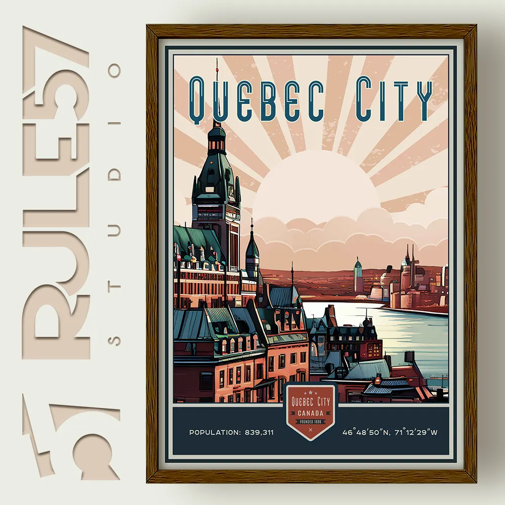 Step into the past with our Retro Cityscapes Collection featuring Québec's iconic skyline, viewed from a rooftop with Chateau Frontenac set against the tranquil St. Lawrence River. This print captures the city's romantic ambiance and architectural beauty in a timeless retro print.