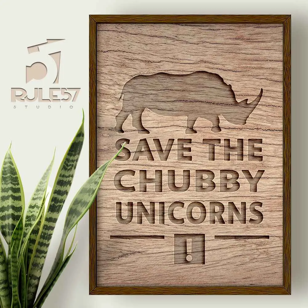 Spread awareness about endangered rhinos with our "Save The Chubby Unicorns" engraved wood art print, combining a lighthearted depiction of rhinos as "chubby unicorns" with a powerful message of conservation.
