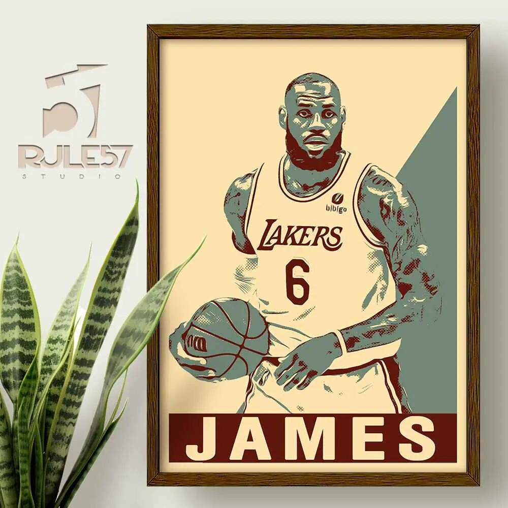 Bring the power of LeBron James to your walls with our retro-style print, highlighting his remarkable achievements and iconic status in a striking three-tone color palette.