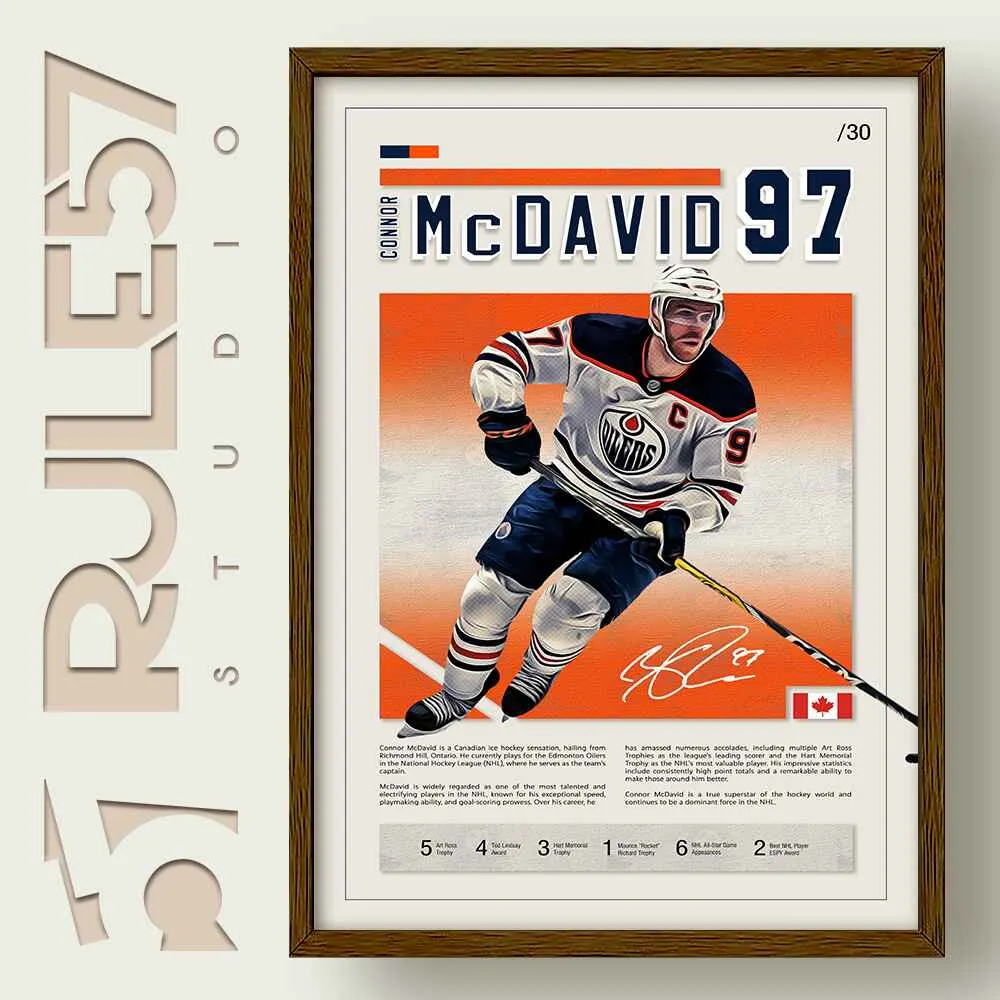 Relive the excitement of Connor McDavid’s gameplay with our Mid-Century Sports Legends Collection. This print captures McDavid in full stride with the puck, set in a vintage mid-century design. Paired with text outlining his career highlights and achievements, it’s a perfect homage to one of hockey’s elite players.